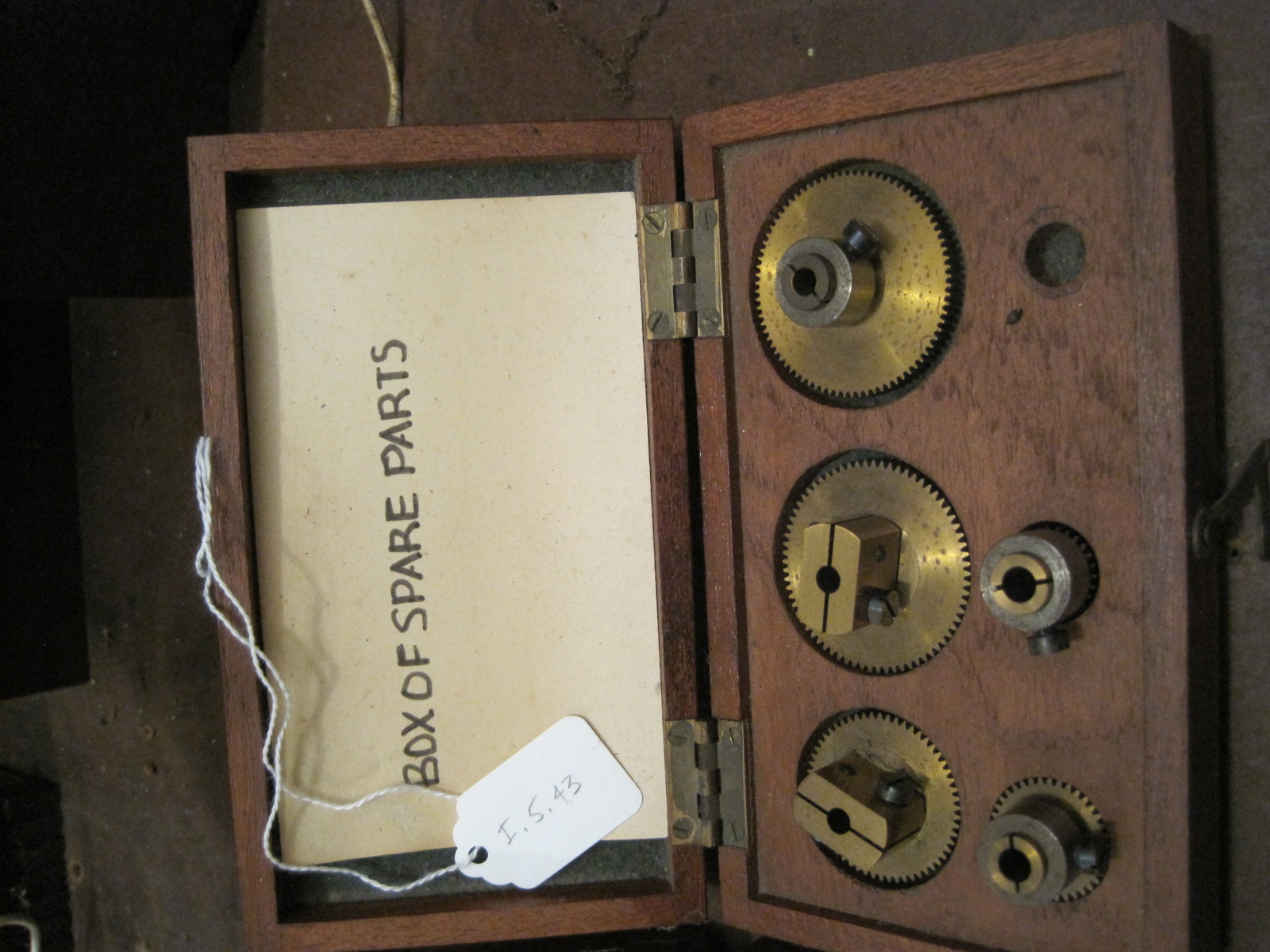 Object Desc wood box, parts with five gears 6.125" x 3.5" x 1.9375"